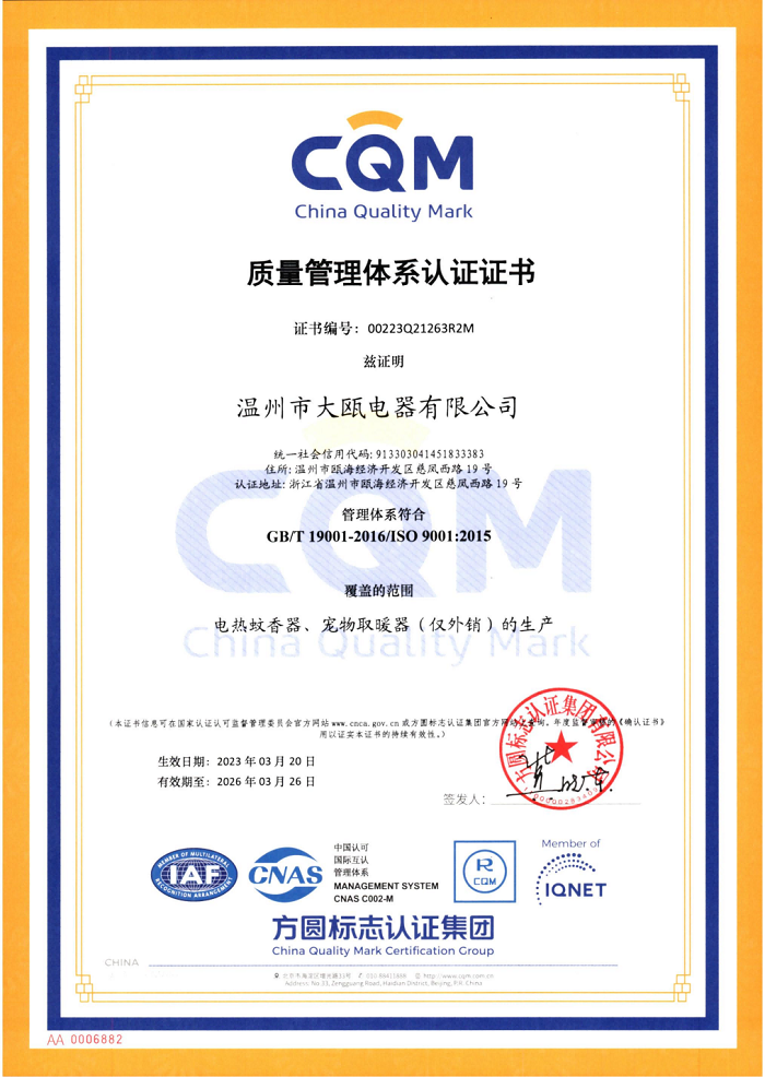 秉承“以人為本,以質取勝”的經(jīng)營理念,三十余載櫛風沐雨,踐行“成就客戶、價值為本、誠信務實、追求卓越”的核心價值觀。大甌公司堅持以產(chǎn)研一體化的經(jīng)營模式與差異化的競爭戰(zhàn)略為基點,持續(xù)推出細分市場上的多種類產(chǎn)品,豐富產(chǎn)品矩陣,滿足消費者多樣化需求,助力新型驅蚊行業(yè)高速發(fā)展。
